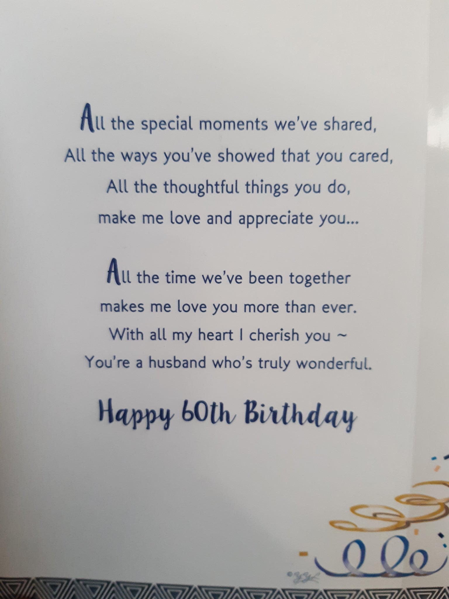 60th Birthday Message For Husband Husband 60th Birthday Card ‘To My Darling Husband On Your 60th : Like Wayne Brady on ‘Let’s Make a Deal,’ Wilson gave her employee an option: 25th anniversary plaque or red, hat box-sized gift . The “You’re Still The One” singer made it her prerogative to wish the Fight Club star a happy 60th birthday on Dec. 18 t go out of her way to send well wishes to the Once Upon A Time .